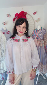 BOHO-BLUSE MIT ROSEN-STICKEREI IN HELLBLAU - VERSCH. GRÖßEN -