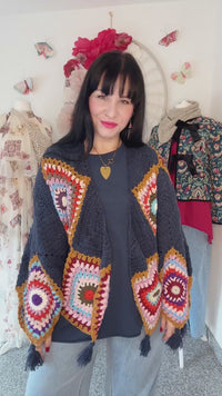 BOHO-HÄKELJACKE GRANNY-SQUARE MIT QUASTEN IN DUNKELBLAU - ONE SIZE -