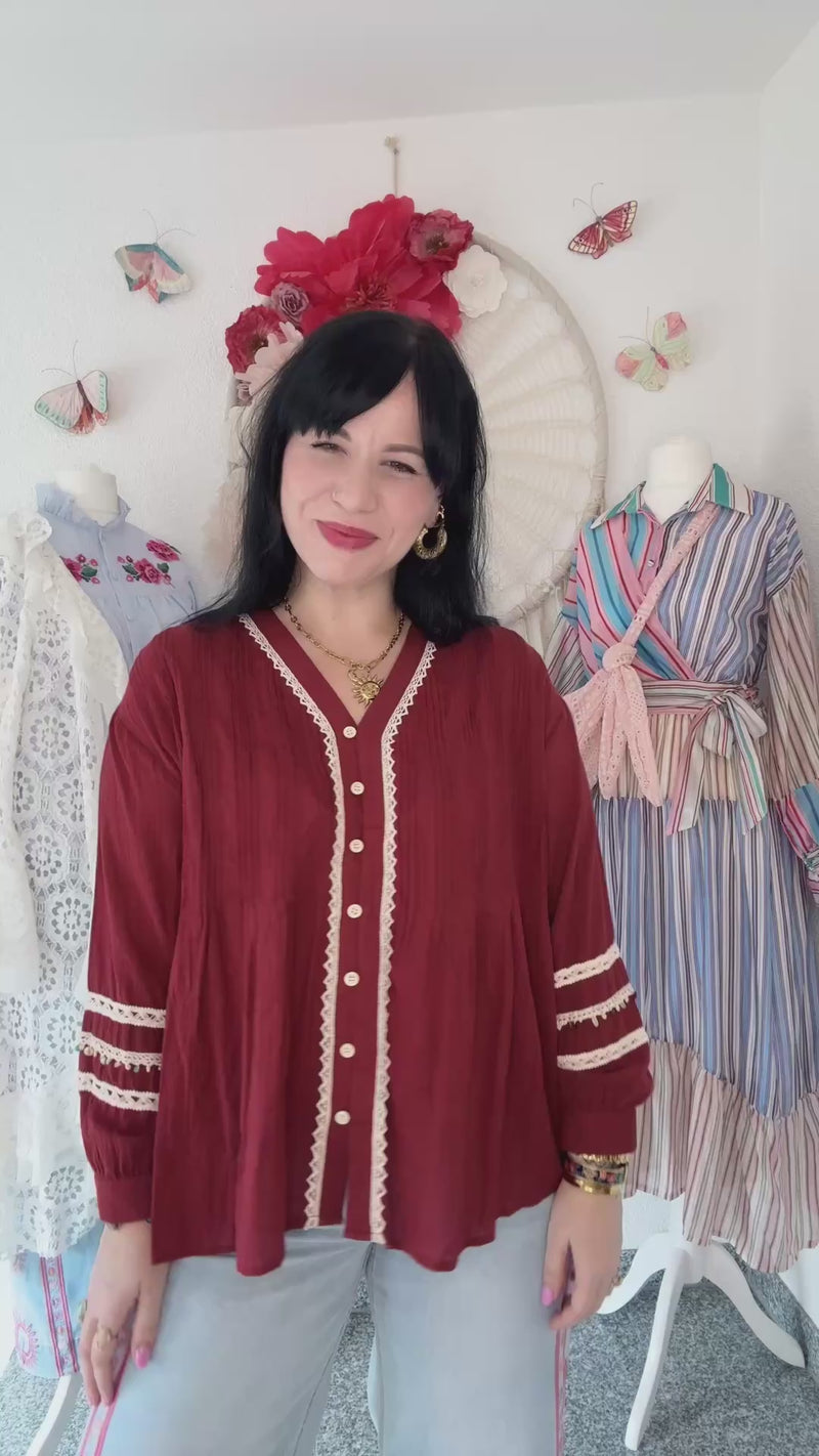 OVERSIZE TUNIKA-BLUSE MIT SPITZENDETAILS UND SCHMUCKPERLEN - ONE SIZE -